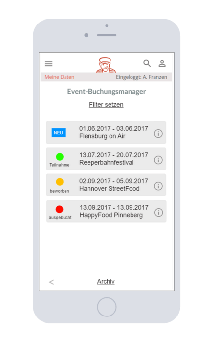 Es werden nur solche Events angezeigt, die zu dem Teilnehmer passen (Marktstand auf einem Markt, CraftBeerTrailer auf einem CraftBeerEvent etc)